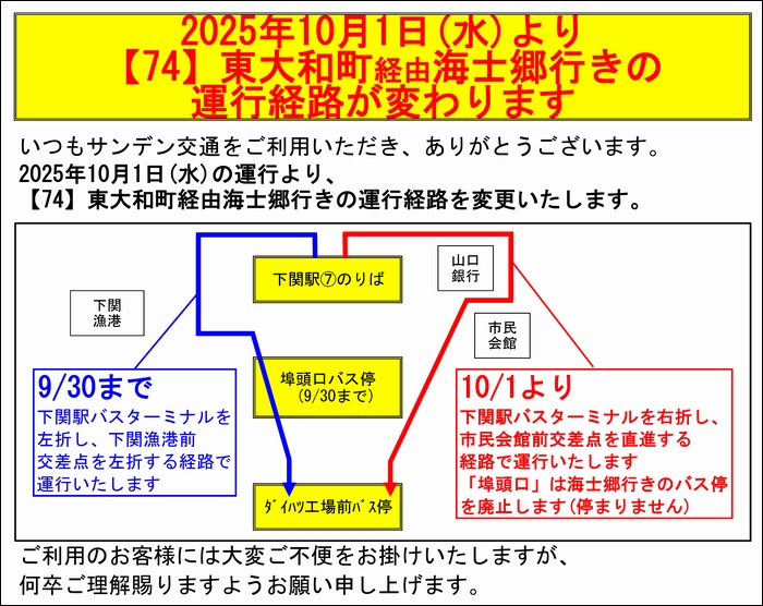 下関駅からダイハツ工場前バス停までの運行経路を変更いたします。