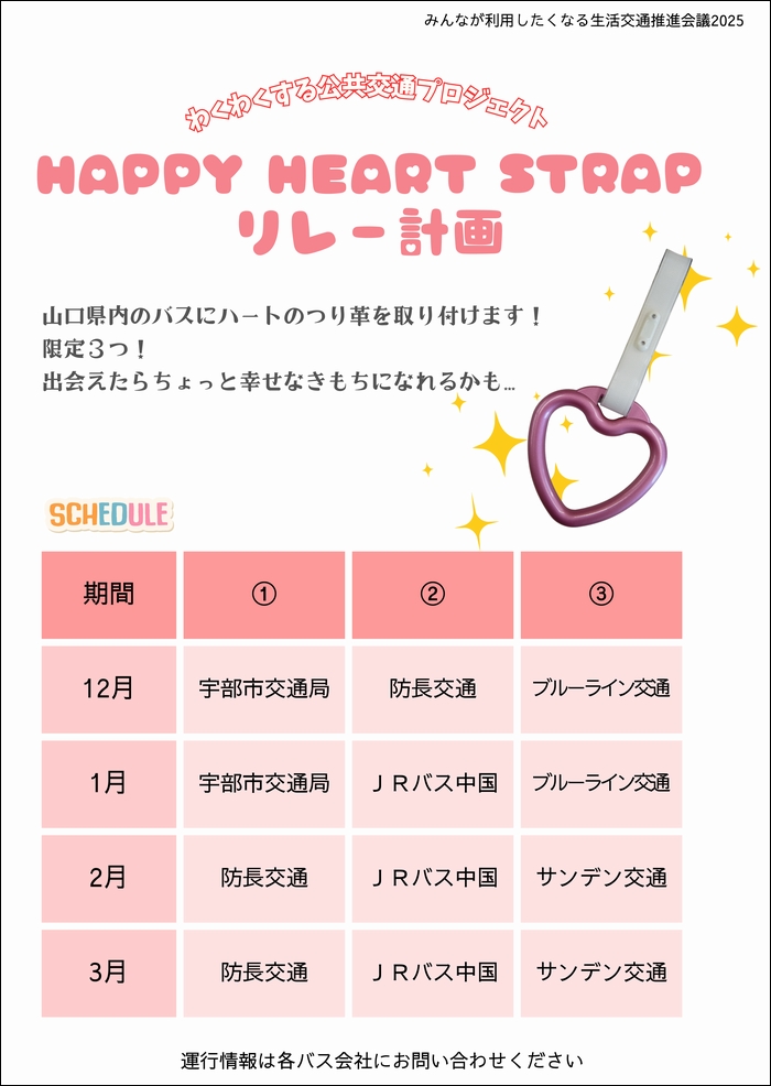 みんなが利用したくなる生活交通推進会議では「わくわくする公共交通プロジェクト」の一環として、山口県内のバス会社による『ハートのつり革リレー』を開催しております。