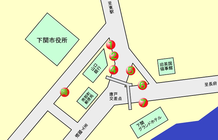 「①・②・④のりば」と「⑤・⑥・⑦のりば」との間は歩道橋が通れません。下関市役所そばの横断歩道をご利用ください。